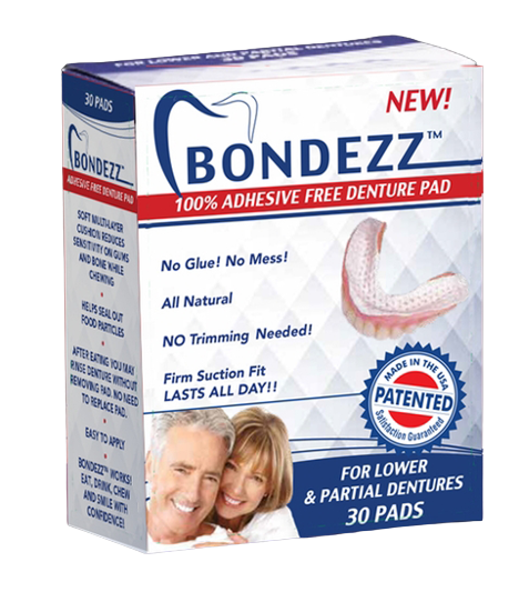Many denture wearers struggle with uncomfortable, painful dentures not to mention the awful taste of the glues, creams or powders that is often used to hold them in. Bondezz is a soft, all-natural adhesive free pad that uses water to form a strong, comfortable bond between your gums and pad without the offensive taste.
